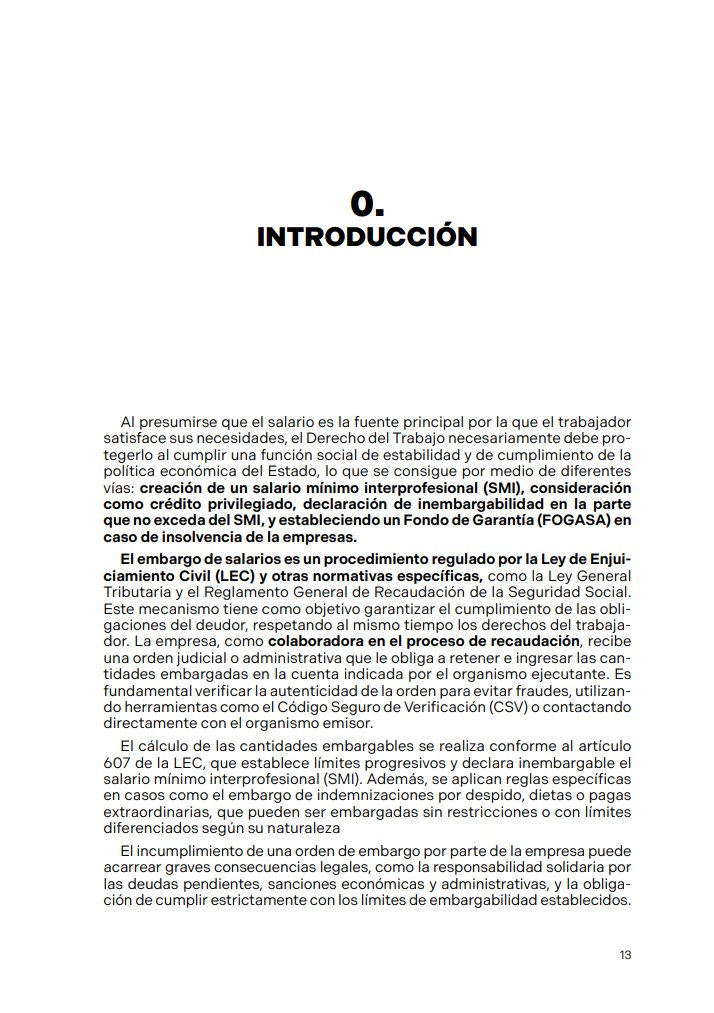 La estructura de la obra está diseñada para guiar al lector paso a paso, comenzando por el conocimiento previo indispensable de la estructura del salario y sus componentes. Se distingue con claridad entre percepciones salariales y extrasalariales, se analiza la cuantía inembargable del Salario Mínimo Interprofesional (SMI) y se explican las escalas progresivas para el cálculo de las cantidades a retener. El manual aborda las diferentes causas que originan un embargo, desde deudas civiles y tributarias hasta multas administrativas o impagos a la Seguridad Social.