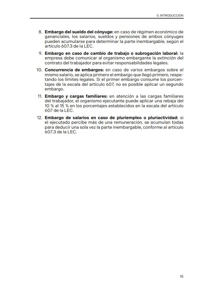 Uno de los mayores aportes de este manual es su enfoque eminentemente práctico, al tratar con profundidad las múltiples casuísticas que generan dudas en la gestión diaria. Se analizan supuestos complejos como el embargo en contratos a tiempo parcial, sobre pagas extraordinarias, indemnizaciones por despido, prestaciones públicas, pluriempleo o la concurrencia de varios embargos sobre un mismo salario. Esta orientación se refuerza con la inclusión de un anexo de casos prácticos que ilustran la aplicación de la normativa en escenarios reales.