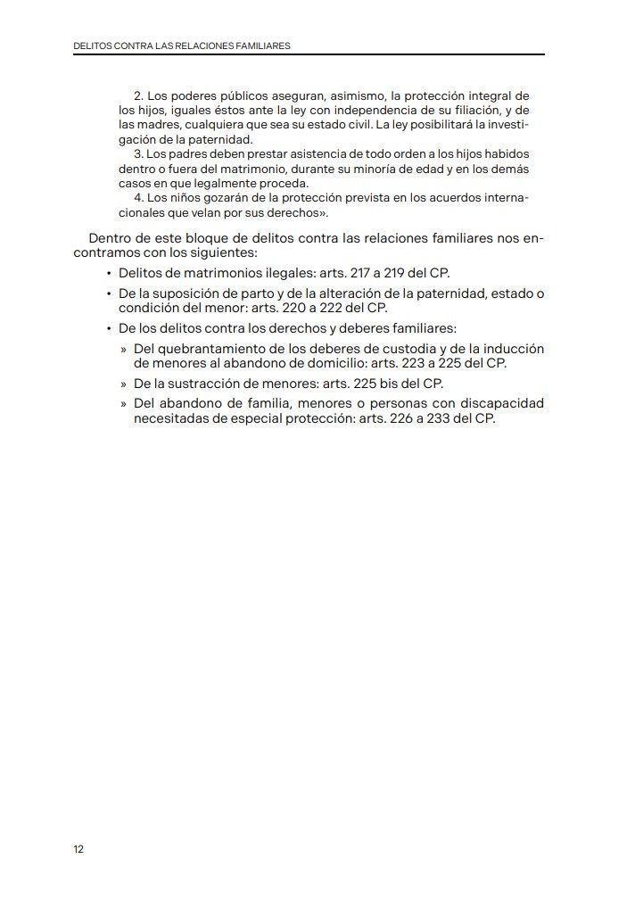 El vínculo familiar, protegido constitucionalmente por el artículo 39 de la CE, es frecuentemente vulnerado mediante conductas delictivas que requieren una respuesta penal precisa y equilibrada. Esta obra aborda en profundidad el Título XII del Libro II del Código Penal, analizando desde la celebración de matrimonios ilegales y la alteración de la paternidad, hasta problemáticas de alta incidencia en los juzgados como el impago de pensiones alimenticias o compensatorias y la sustracción de menores.