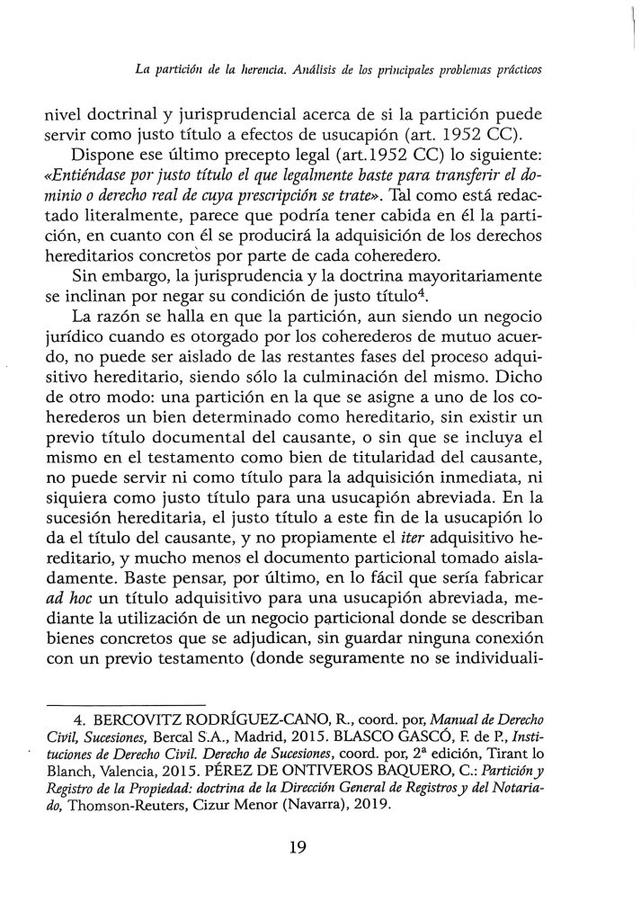 El libro realiza un recorrido exhaustivo por las distintas clases de partición (por el testador, por coherederos, por contador-partidor dativo o judicial), pero su verdadero valor reside en el análisis de los problemas prácticos reales. Se abordan cuestiones críticas como la inclusión o exclusión de partidas en el inventario (donaciones a la esposa, gastos de enfermedad), la valoración de bienes ante desequilibrios injustificados y la siempre compleja rescisión por lesión.