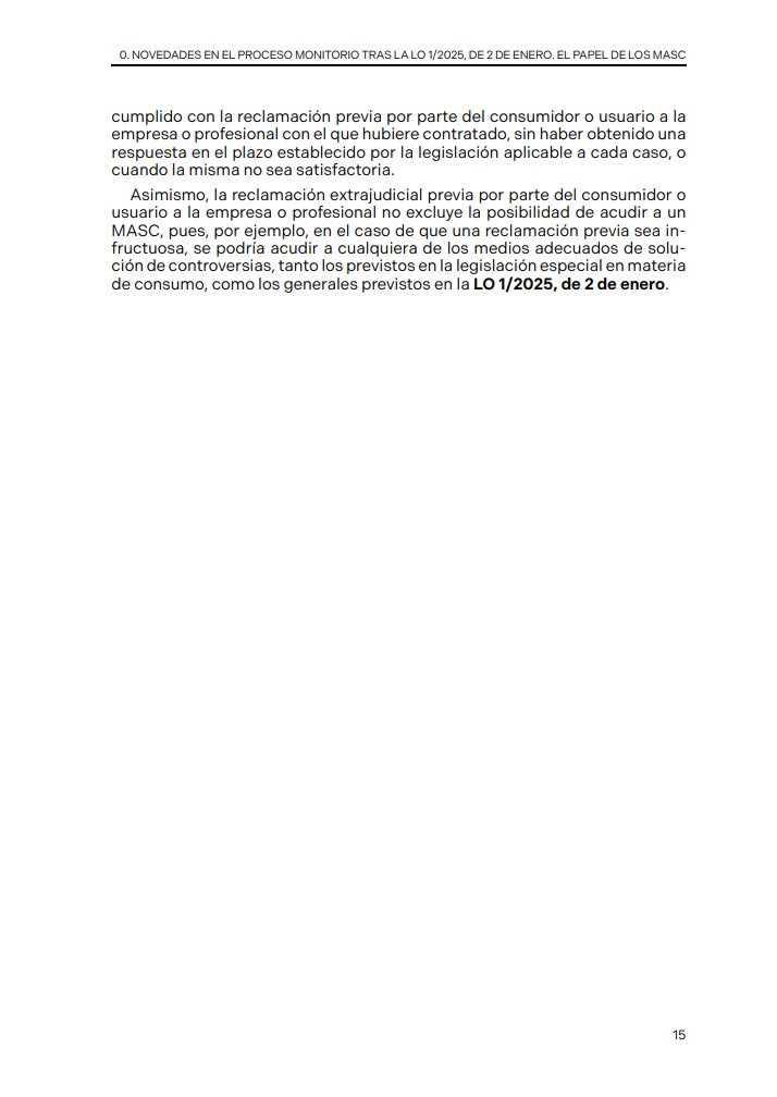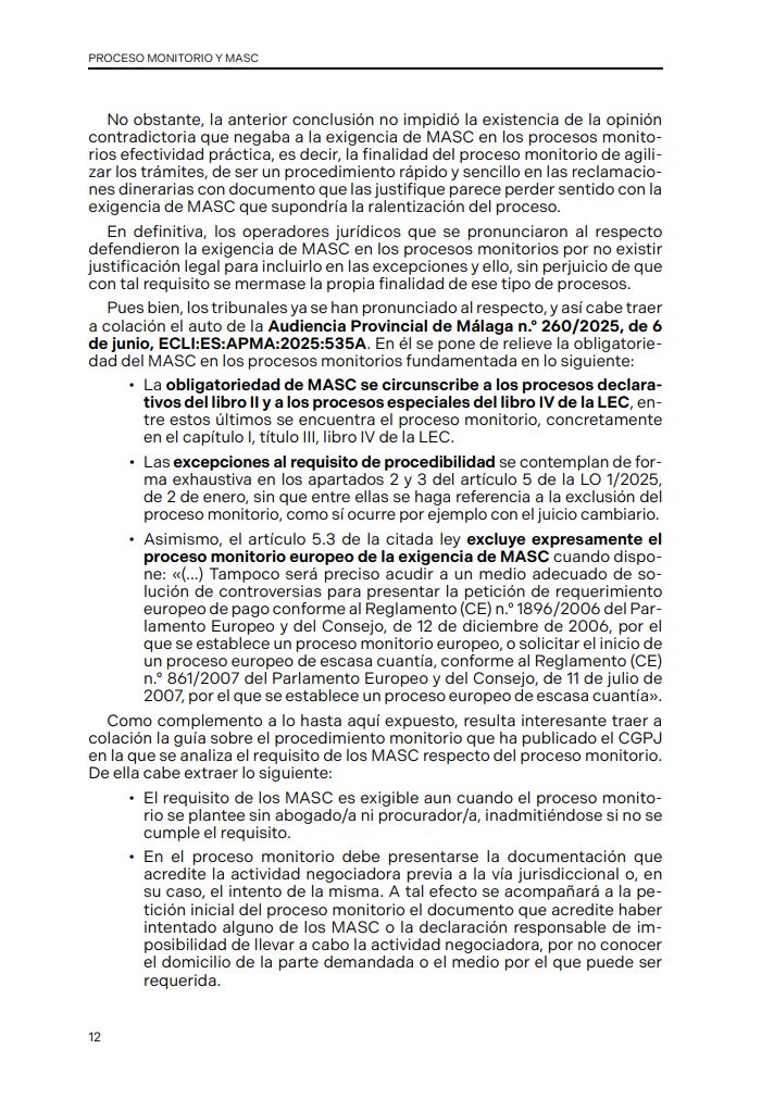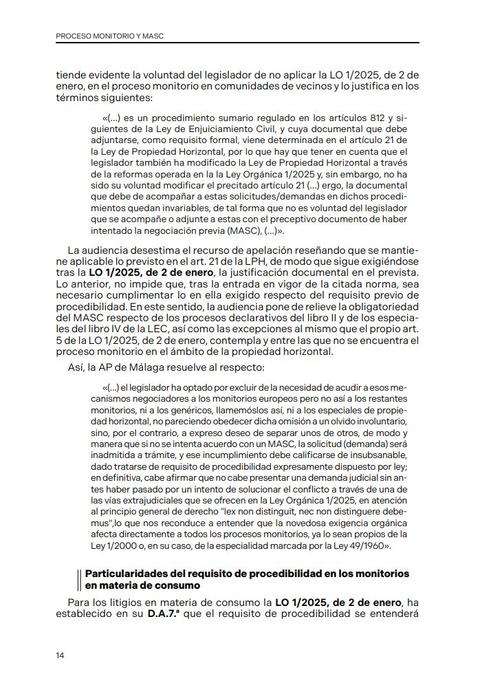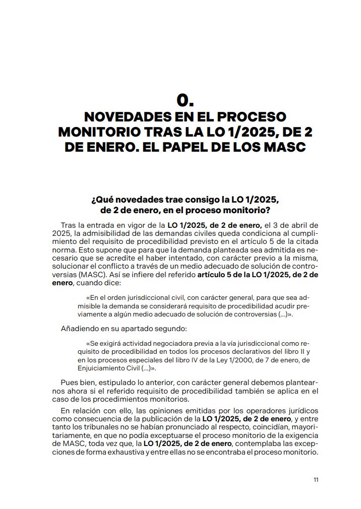 El procedimiento monitorio se consolida como la vía más eficiente para la reclamación de deudas dinerarias, si bien su tramitación ha sido objeto de una profunda reforma con la entrada en vigor de la Ley Orgánica 1/2025. Este texto aborda de manera exhaustiva el nuevo escenario, analizando el impacto de la incorporación de los Medios Adecuados de Solución de Controversias (MASC) como requisito de procedibilidad indispensable, una modificación que transforma la estrategia procesal y exige una actualización inmediata por parte de los profesionales del derecho.